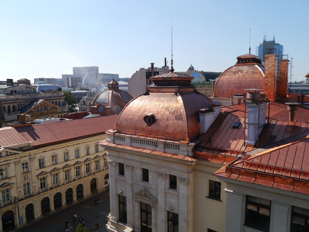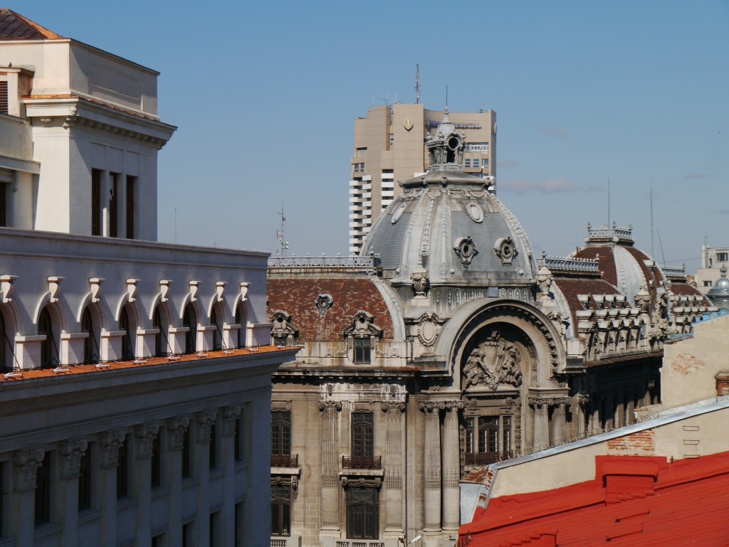 View from our balcony at the Hotel Rembrandt. The copper-domed building is the National Bank of Romania.